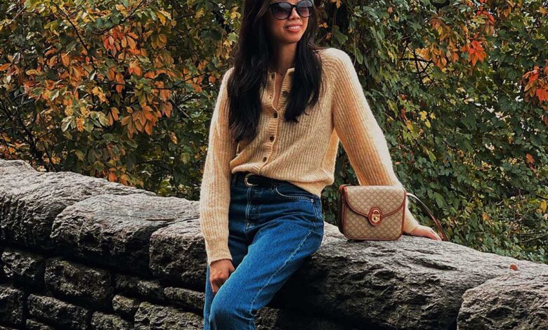 wearing alpaca cardigan, jeans, loafers & vintage bag