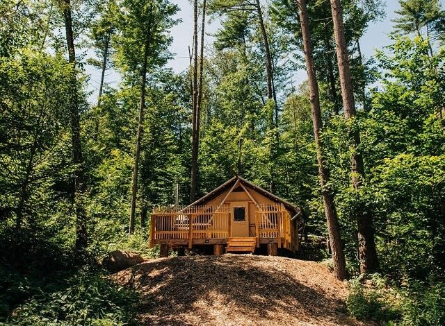 Experience an unforgettable glamping trip in the heart of the sprawling Adirondacks, just a few miles outside Lake George. Nestled at the base of Kenyon Mountain and spread out over nearly 300 acres of woodlands, Huttopia offers four different styles of wood frame and canvas tents fit for small groups, families, adventurous couples, or friends to relax in after a day of exploring nature. Some tents are outfitted with kitchens and bathrooms, but all accommodations feature wood stoves that keep things cozy, a BBQ grill, and firepit for s’more-making under the stars. On-site amenities include a swimming and wading pool, playground, and main lodge that houses a cafe, camp store, games, and an upper deck with spectacular views of the surrounding forest. Huttopia has family-friendly activities daily during peak season and also welcomes furry friends.