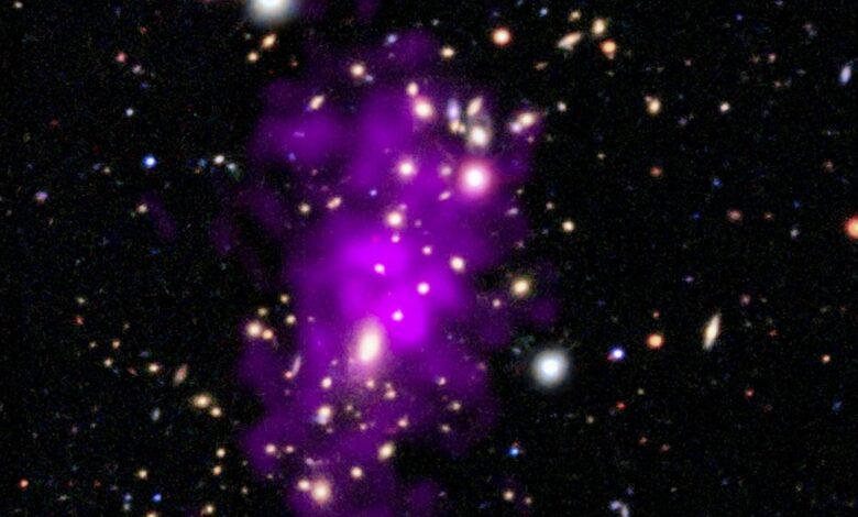 The object was first discovered on December 31, 2020. But the new image combines data from NASA’s Chandra X-ray Observatory—which sees the superheated gas of the merging clusters as purple bubbles—and a collection of ground-based optical telescopes that contribute the starry background.