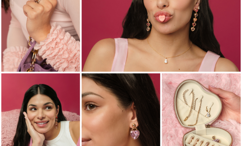 Inspired by early-2000s girlhood, the collection reinterprets nostalgic “be mine” energy through a modern-day lens. Playful silhouettes and subtle sparkles come together in pieces that make every day feel romantic. Pink heart-shaped drop earrings, stackable sweetheart rings, a heart bag charm, and a bejeweled heart-shaped jewelry case create a stylish, affordable assortment made to adore now and long after Valentine’s Day.