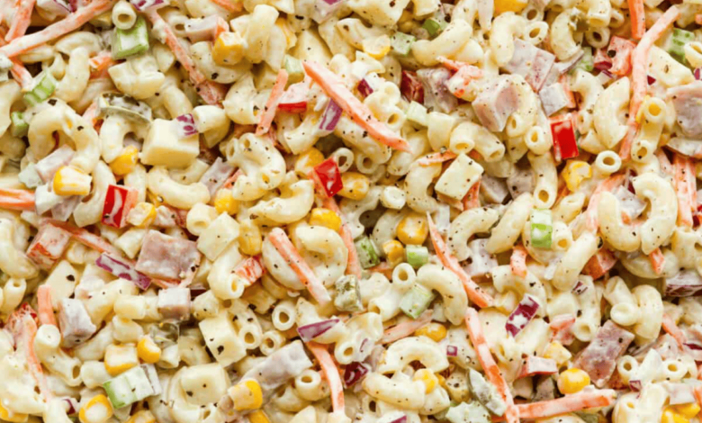- Combine: To the bowl of pasta, add diced ham, corn, shredded carrots, diced bell pepper, Monterey jack cheese, diced celery, diced red onion, and chopped pickled jalapeño.