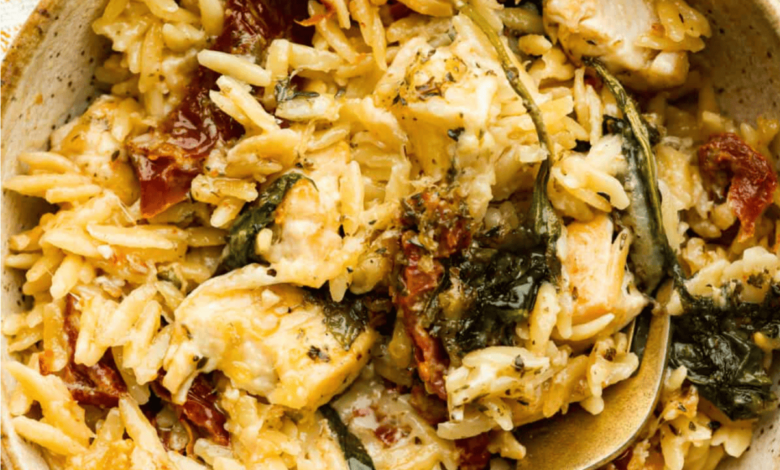 This creamy Tuscan chicken orzo bake is the kind of dinner you’ll want on repeat! Tender chicken, orzo, and sun-dried tomatoes bake together in one pan for an easy weeknight meal.