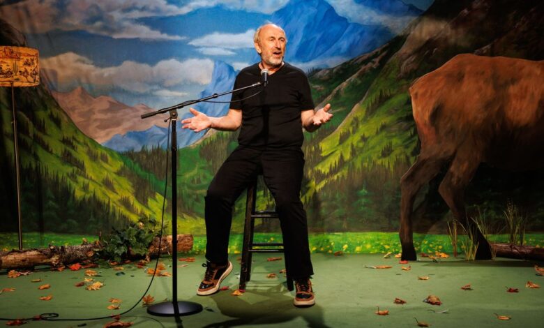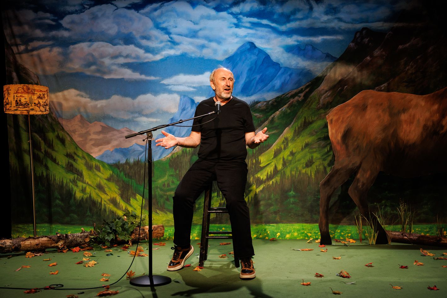 In the cozy space of the Bushwick Starr, Cale sits in a black T-shirt and pants on a stool at a microphone in front of a painted backdrop of a mountain vale by Colleen Murray. It’s a set-up, directed by Les Waters, that flirts with the nostalgic kitsch of hotel decor you might find at a national park—behind Cale, there is also a rawhide lamp and a large painted standee of a bull elk—but which can, through the often moon-like glow of Mextly Couzin’s lighting, take on shades of the vast and serene or the ominous. You settle into scenery in the way that Cale settles into his story. Narrating in the first person, he plays a writer who takes up a job working for an aspiring film producer who invites him to stay in his house in Sun Valley, Idaho, and draft a film script. The movie idea is an obvious bust, but the job gives Cale’s character an excuse to wander around the area observing the foreign-to-him customs. He becomes fascinated by a “trailing of the sheep” event, makes extended eye contact with a handsome younger ranch hand, Will, who’s throwing candy to passersby, and then fortuitously runs into him again. They talk, flirting without acknowledging it, and soon they’re on not-quite dates—Will, in the closet around his co-workers, always introduces the writer as his employer—and then experimenting in bed. Cale’s descriptions of sex are, like the rest of his monologue, frank, finely observed, and charged with both horniness (not since Andrew Scott romancing himself in Vanya has a solo performer vividly conjured the presence of two bodies) and an eye for telling foibles. In the midst of the building romance, he devotes a mini set piece to the act of biking to a small-town pharmacy to discreetly purchase lube.