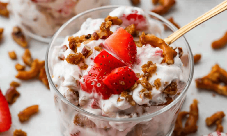 - Combine: Wait until just before serving to fold in the crushed pretzels and diced strawberries so the pretzels stay crunchy and the filling doesn’t get runny.