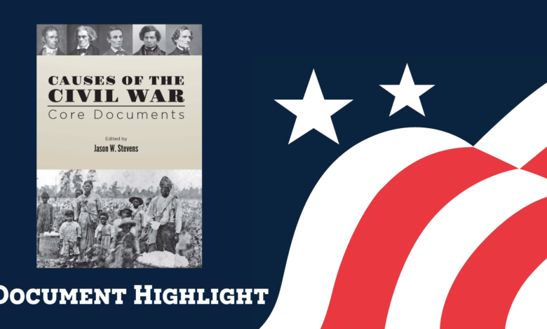 Teaching American History re-released its Core Document Collection volume, Causes of the Civil War, in early September 2025. This volume of original documents, curated by Dr. Jason W. Stevens, includes an introduction, 26 significant documents from the antebellum era, a Thematic Table of Contents, and Study Questions for each document. Like most teachers, I wish I had the time to discuss every one of these primary sources with my students. Given the time constraints we all face, I assigned Thomas Jefferson’s letter to John Holmes when teaching the Missouri Compromise. For insight into the debate over slavery, I assigned Frederick Douglass’s speech “What to the Slave is the Fourth of July?” and excerpts from the Dred Scott decision. These three documents are in the CDC Causes of the Civil War volume.
