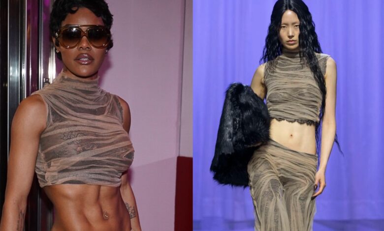 Teyana Taylor stepped out for Kim Kardashian’s birthday party wearing a sheer, ruched two-piece ensemble from Dipetsa’s Fall 2025 collection. The bold design showcased her sculpted abs and signature edge, blending avant-garde artistry with feminine sensuality.