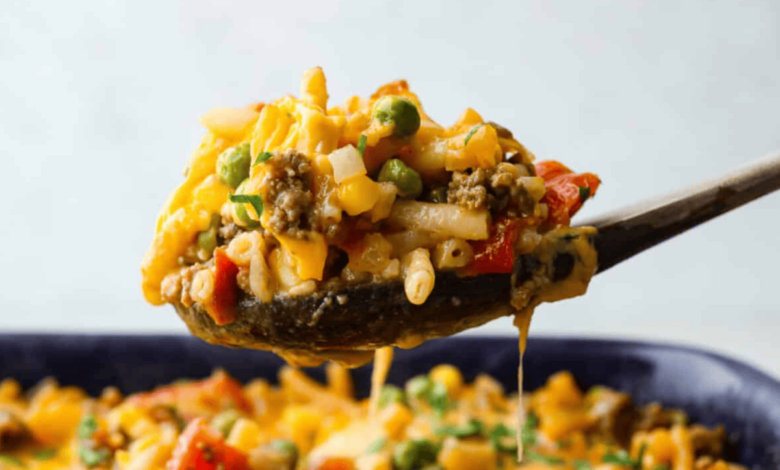 - Rice Version: Leave out the mac and cheese, milk, and butter. Spread ½ cup uncooked long-grain rice in the bottom, mix ⅔ cup water into the meat and veggie mixture, then pour it over the rice. Bake for about 1 hour, adding 5 minutes at a time until the rice is fully cooked.