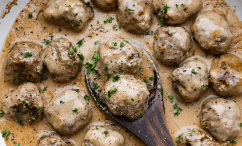 Add the meatballs back to the skillet and simmer for another 1-2 minutes. Serve over egg noodles or mashed potatoes.