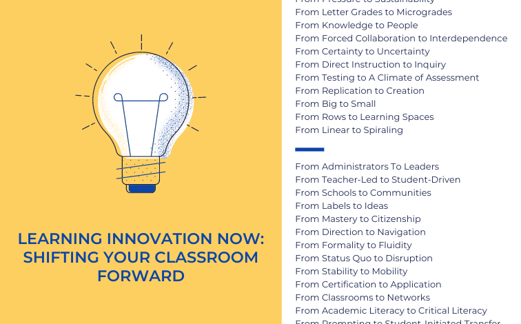 Since I’m not going to explain how to accomplish these kinds of shifts (that’d be a book), though, I do refer to some of the posts I’ve created over the years that elaborate on some of these ideas. The purpose of this post, then, is to vaguely sketch the possible characteristics of an innovative classroom.