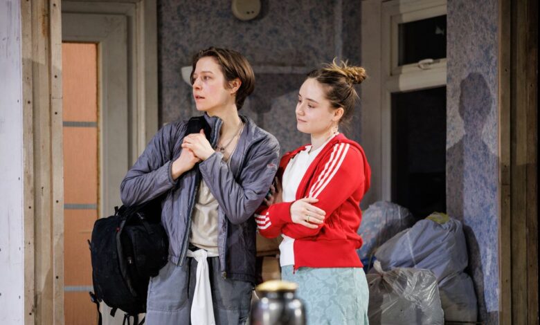 At least that’s how it felt to watch Zeldin’s revision of Antigone, which moves things from Thebes to a home under renovation somewhere outside London. At 80 minutes, it presents a slim, incompletely cutting family reckoning, one that spills a little blood but doesn’t sever any arteries. Emma D’Arcy (most familiar to us Americans as a queen on House of the Dragon or for their taste in negronis) is Annie, a wayward niece who suddenly returns to her family’s estate after her uptight uncle, Chris (Tobias Menzies, the knifelike lines in his jaw well utilized here), announces his plans to scatter the ashes of Annie’s father, Adam, which have been sitting around in an urn for years. Annie objects ferociously, insisting the ashes should stay at home, stirring up the currents of familial resentment and dragging her sister, peacemaking Issy (Ruby Stokes), into them.
