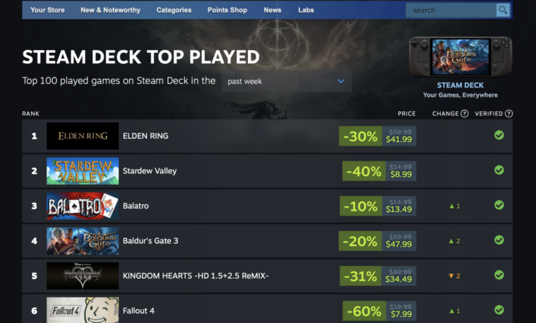 At the chart’s launch, Elden Ring unsurprisingly holds the top spot after the recent Shadow of the Erdtree release (). Indie fave Stardew Valley is currently in second and hot deck-builder Balatro is in third. Both Hades 2 and Hades have made the top ten. There are some surprising entries too, such as Kingdom Hearts HD 1.5 + 2.5 ReMIX in fifth place and Fallout 4 in sixth. If you want to add anything on the Steam Deck chart to your library, now’s the chance to load up your to-be-played queue for cheap with the .
