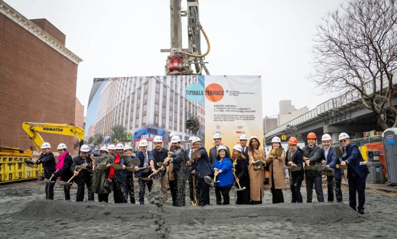 An affordable housing project first conceived as part of the East Harlem rezoning 10 years ago has finally kicked off construction. The city on Wednesday broke ground on Timbale Terrace, a 100 percent affordable tower with 341 apartments and a new theater and performing arts center for Belongó, formerly known as the Afro Latin Jazz Alliance. Located at East 118th Street and Park Avenue, the site sat vacant for decades before most recently serving as a police department parking lot.