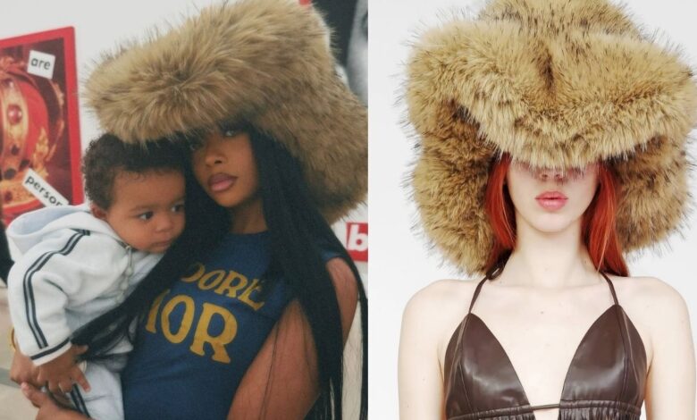 Skai Jackson recently posed on the ‘gram alongside her adorable son Kasai in a $295 brown Kim Shui statement faux fur hat. Her oversized vegan fur cowboy shaped hat added depth to her fashionable ensemble.